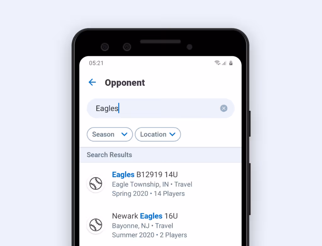 When adding your next game, you’ll notice the same season and location filters within opponent search. You won’t see the sport filter, as we automatically limit opponent search results to match your sport (i.e. baseball teams will only see other baseball teams when searching for an opponent).